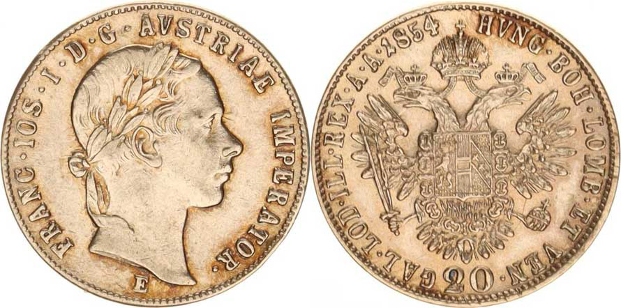 František Josef I.(1848-1918), 20 kr. 1854 E "R"