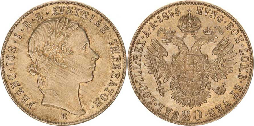 František Josef I.(1848-1918), 20 kr. 1856 E "R", mír. just.