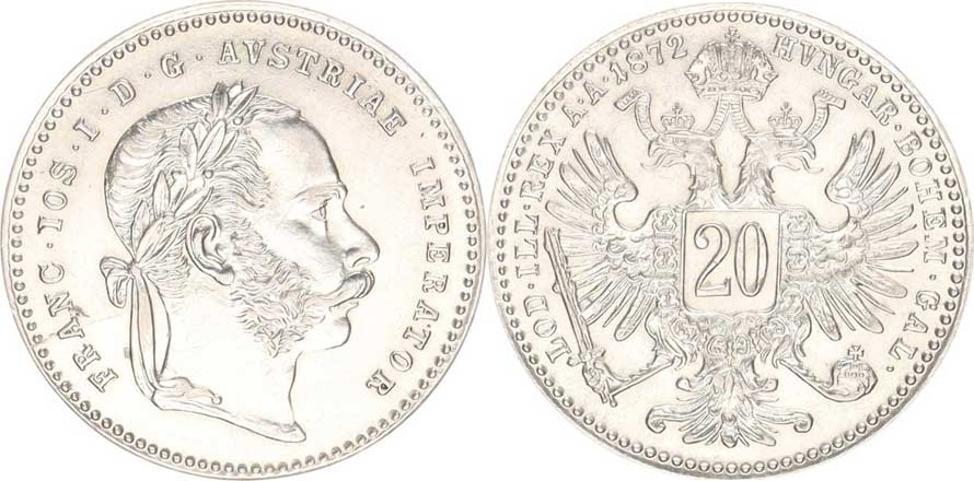 František Josef I.(1848-1918), 20 kr. 1872 b.zn. "RR", tém.