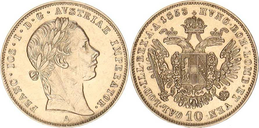František Josef I.(1848-1918), 10 kr. 1853 A, rys. v av.
