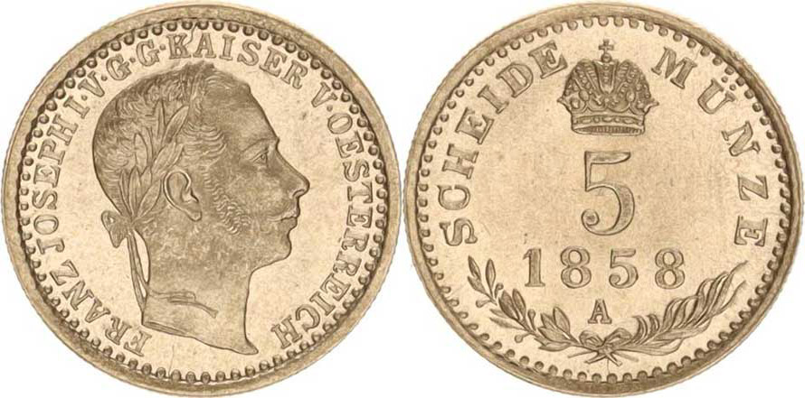 František Josef I.(1848-1918), 5 kr. 1858 A, var.: av +rev. pootočen "R"