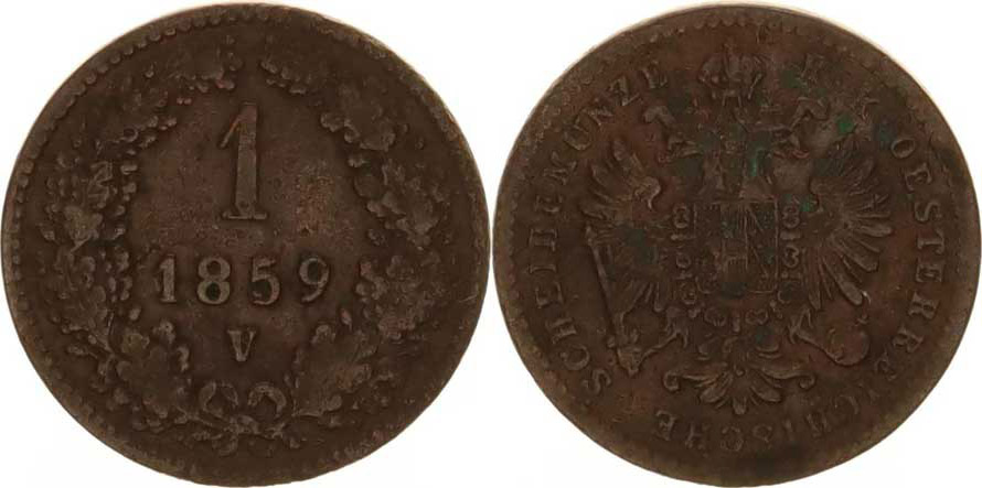 František Josef I.(1848-1918), 1 kr. 1859 V "R", v rv. Cu skvr.