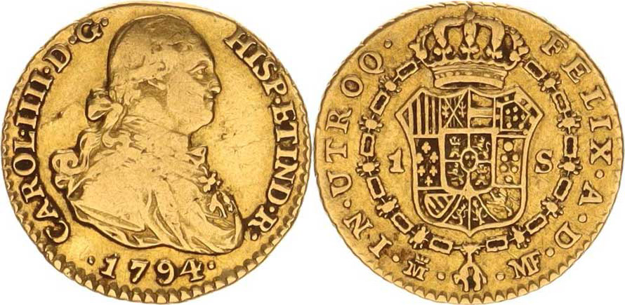 Španělsko, Carlos IV. (1788-1808), 1 Escudo 1794 M MF KM 434 "R" 3,295 g