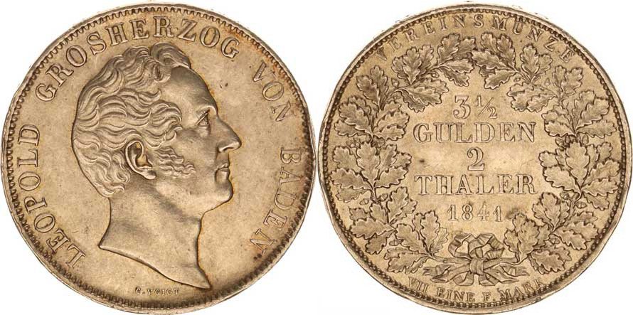 Baden, Leopold I. (1830-1852), 2 Tolar (3-1/2 Gulden) 1841 KM 212; Dav. 524 "R"