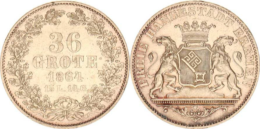 Bremen, 36 Grote 1864 KM 243 "R", nep. hr., rys.
