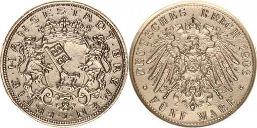 Bremen, 5 Marka 1906 J KM 251 "vystřižená ze dna talířku" 21,4