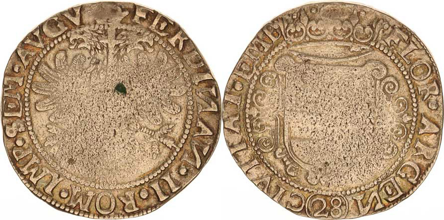 28 Stuber b.l. (1624-1637), s tit. Ferdinanda II. jako KM 11 ale všechná písmena "N" jsou obrácená ! 19,762 g , mělká ražba, střed nedor., opis 1/1, stopa ?