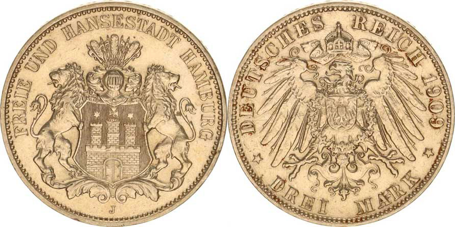 Hamburg, 3 Mark 1909 J KM 296, vl. rys.