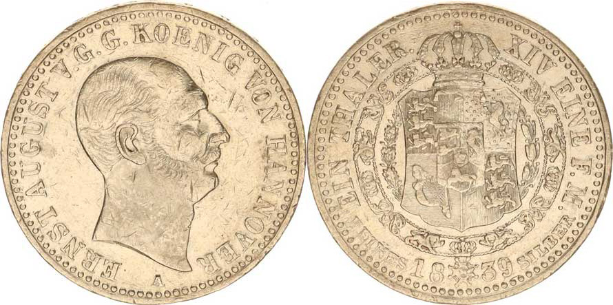 Hannover, Ernst August (1837-1851), Tolar 1839 A KM 182, škr. v av., tém.