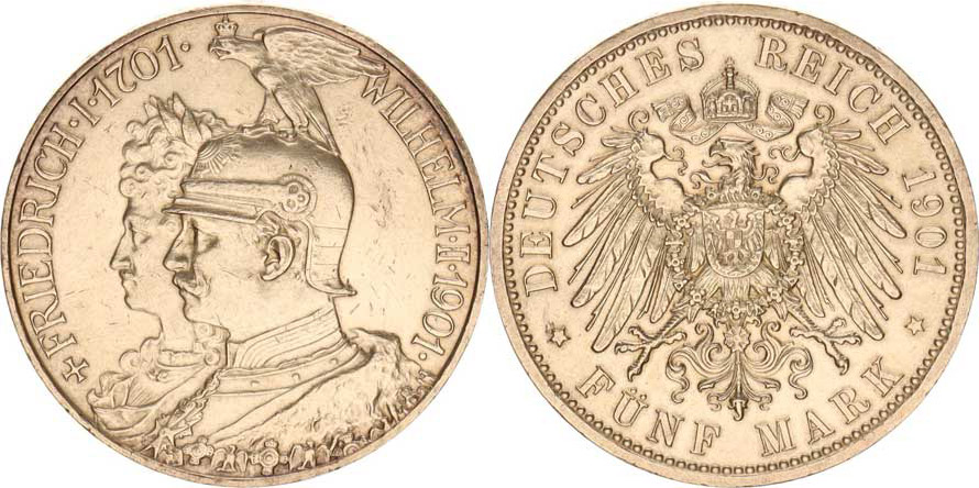 Prusko, Wilhelm II. (1888-1918), 5 Mark 1901 A - 200 let království KM 526, zc. nep. rys.