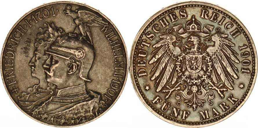 Prusko, Wilhelm II. (1888-1918), 5 Mark 1901 A - 200 let království KM 526 "patina"