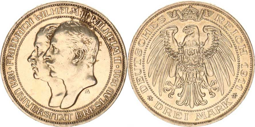 Prusko, Wilhelm II. (1888-1918), 3 Mark 1911 A - Univerzita Breslau Y. 131, dr. oxyd. skvr.