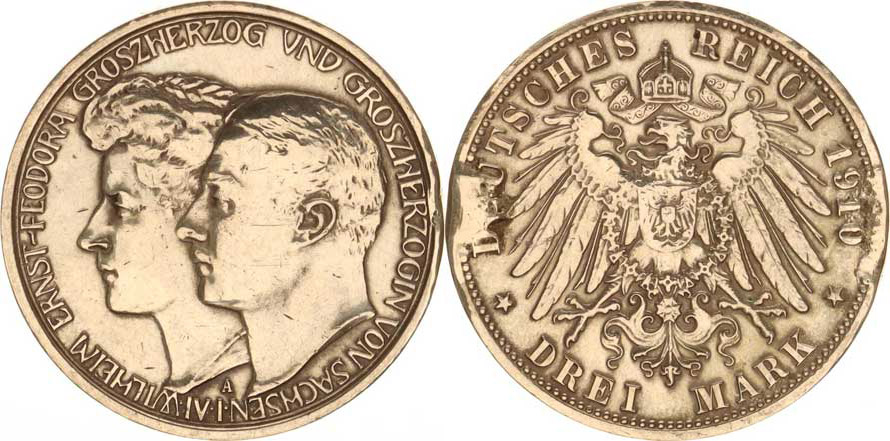 Sasko - Weimar - Eisenach, Wilhelm Ernst (1901-1918), 3 Mark 1910 A - Druhá svatba Y. 176 "R"