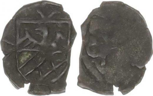 Městský haléř dvoustranný, Znak / gotické písmeno E Castelin: Chebské mincovnictví v době grošové, NSb III, 1956, s. 101, č. 36 - vzácný typ s ozdobami u štítu tvaru V "RR" , kraj. stř.