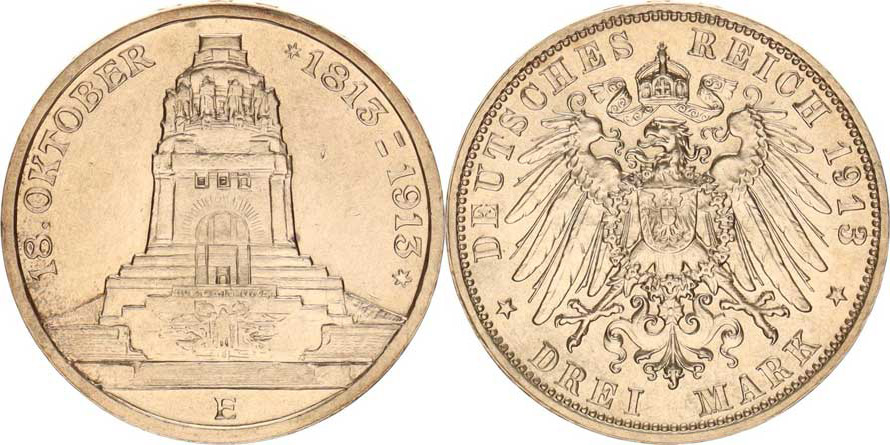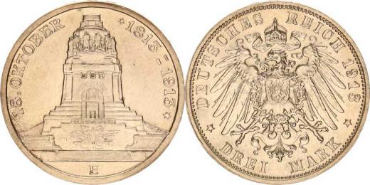 Sasko, Friedrich August III. (1904-1918), 3 Mark 1913 E - památník Lipsko Y. 200; KM 1275