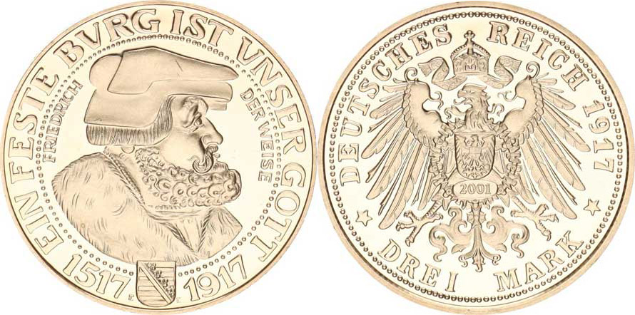 3 Mark 1917 E - Friedrich der Weise, výr. reformace KM 1276 značená novoražba "2001" Ag