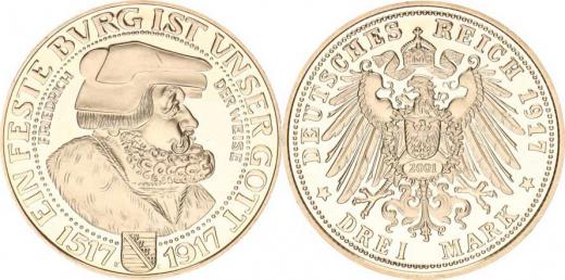 Sasko, Friedrich August III. (1904-1918), 3 Mark 1917 E - Friedrich der Weise, výr. reformace KM 12