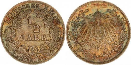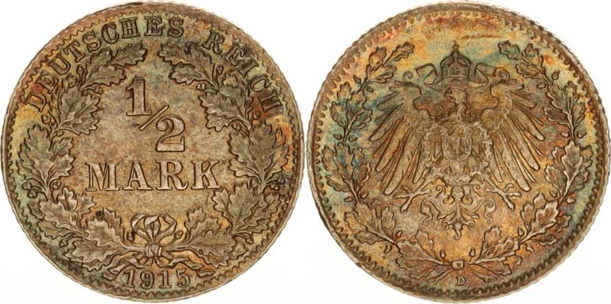 Německo, drobné ražby císařství, 1/2 Mark 1915 D, patina