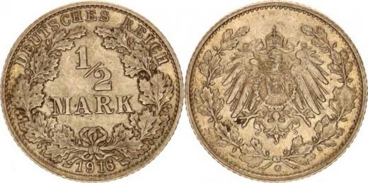 Německo, drobné ražby císařství, 1/2 Mark 1916 G