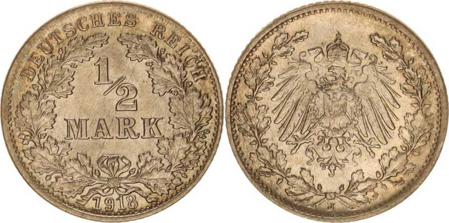Německo, drobné ražby císařství, 1/2 Mark 1918 J