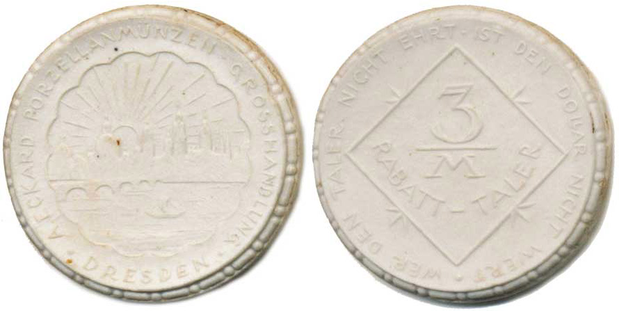 Německo, Nouzová platidla, Dresden - Grosshandlung A. Eckard, Porzellanmünzen, silueta města
