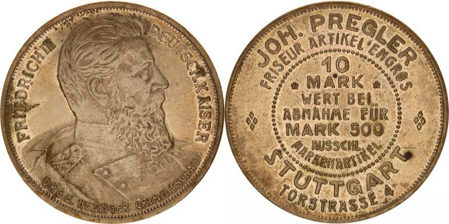 D. R. G. M. Henziger Crimmitschau, poprsí císaře Friedricha III. zprava / Joh. Pregler Stuttgart - 10 Mark b.l. bílý kov 40 m m
