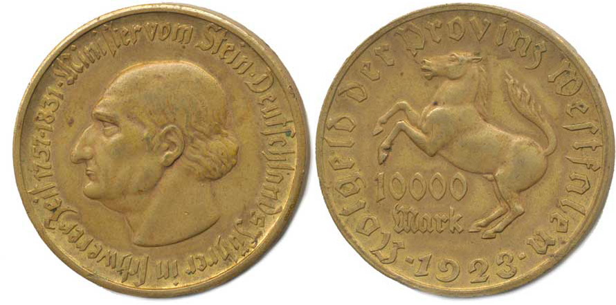 Westfahlen - 10 000 Mark 1923, Stein bronz zlacená 44 mm F. 645.7b, J.N. 20b "RR", otřelé zlacení