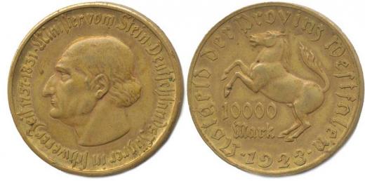 Německo, Nouzová platidla, Westfahlen - 10 000 Mark 1923, Stein bronz zlacená 44 mm