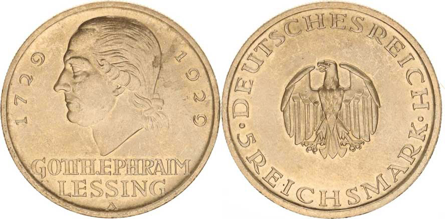 Výmarská republika (1918-1933), 5 RM 1929 A - Lessing KM 61, nep. rys.