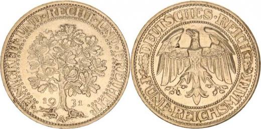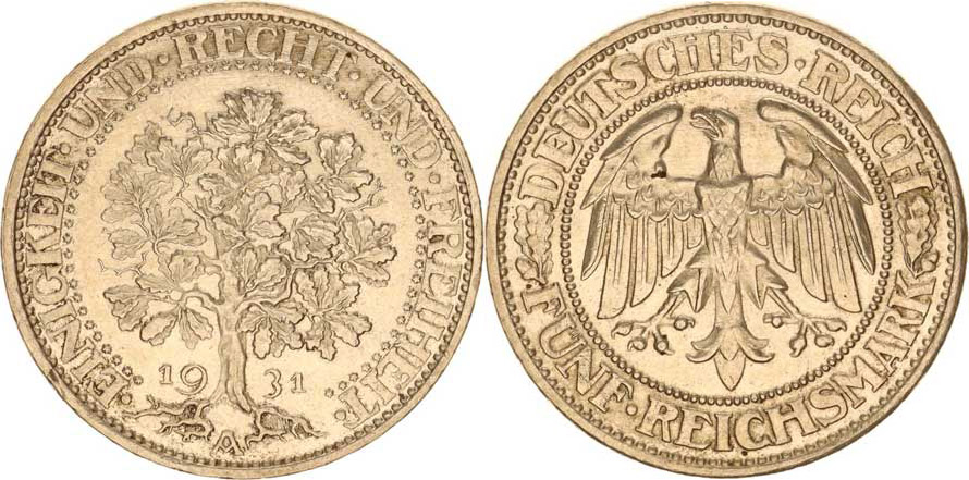 Výmarská republika (1918-1933), 5 RM 1931 A - dub KM 56, tém.