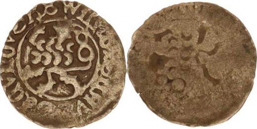 Bílý peníz jednostranný, měsíčky hřívy propojené, pod lvem kulič ka Castelin NČČsl. 1930 č. 6, nep.nedor.