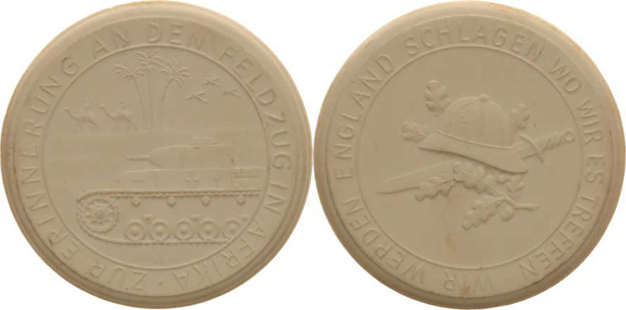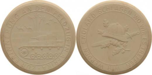 Na památku tažení do Afriky, V popředí styliz. afric. krajiny tan k, opis / na dubové snítce meč a přilba, opis: WIR WERDEN ENGLAND SCHLAGEN WO WIR ES TREFFEN bílý porcelán 49 mm kat. č. 1879 n