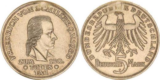 Německo - BRD (1949-), 5 DM 1955 F - Schiller "RR" KM 114, zaprav. dírka