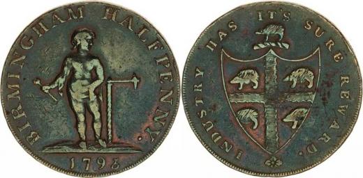 Tokens = 1/2 Penny 1793, BIRMINGHAM, stojící chlapec / INDUSTRY HAS IT´S SURE REWARD., erb