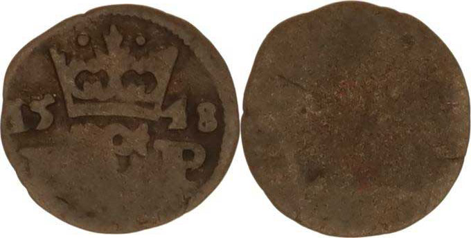 Malý (černý) peníz 1548, K.Hora MKČ 85 var.: nad korunou dvě tečky, nedor.