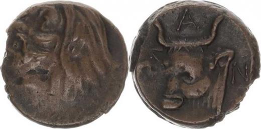 AE 17, Hlava vousatého Pana zleva / Hlava s krk býka zleva, řecká písmena PAN SNG BM 881