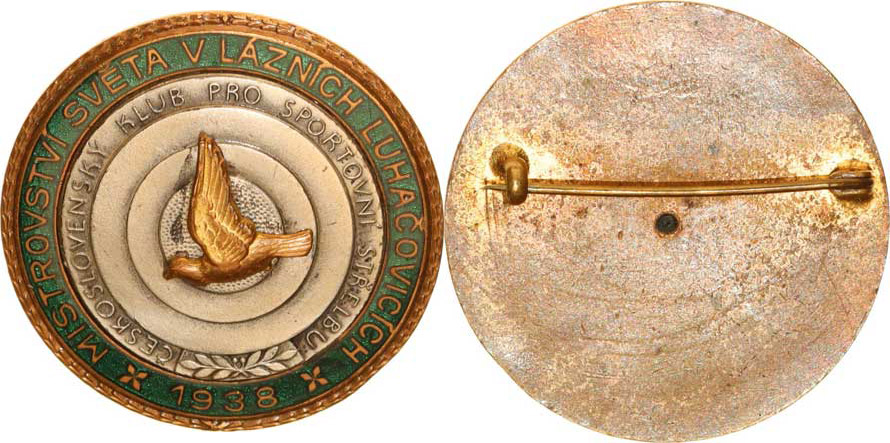 Odznak - Mistrovství světa v lázních Luhačovicích 1938 - Českoslo venský klub pro sportovní střelbu, Zlatý letící holub uprostřed s tříbr. terče, v zelen. smaltu zlatý nápis mosaz +smalt 41 mm zapín. spona "krásný"