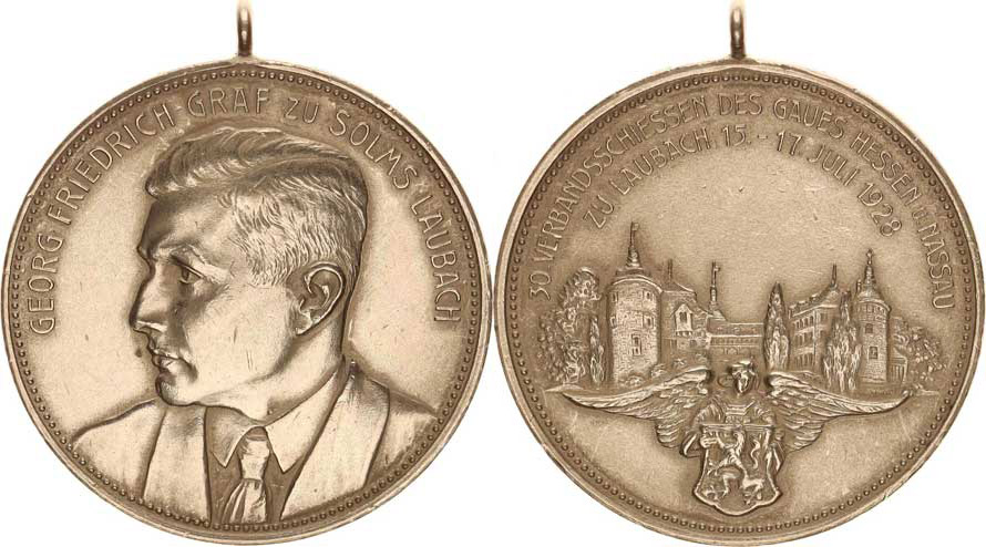 Laubach - 30. Spolkové střelby Hessen-Nassau 15.-17.7. 1928, Pod budovou zámku anděl s rozepjatými křídly drží erb, opis / Georg F riedrich hrabě Solms-Laubach, Poprsí mírně zleva, opis Ag 40, 5 mm 26,555 g orig. ouško