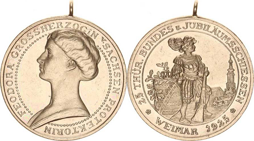 Weimar - 25. duryňská spolková a jubilejní střelba 1925, Střelec v historickém kostýmu drží mušketu a opírá se o erb, napravo kost el, opis / Protektorka Fedora arivévodkyně Saxe-Weimar-Eisenach, portrét zleva a opis Ag 990 14,909 g 33,5 mm orig. ouško ,