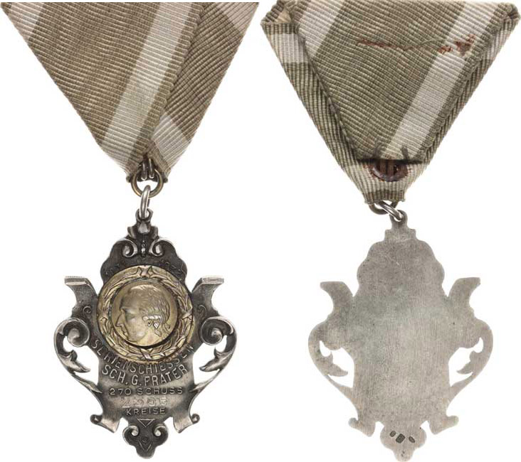 Vídeň - Ostrostřelecký spolek PRATER - "1931-1932 Serienschiessen Sch. Prater" - na 270 výstřelu, zásahu (doryto 2306), V medailonu hlava Josefa II. tvar poháru 34x45 mm punc. Ag 900 +stuha