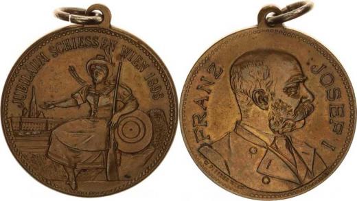 Vídeň - Jubilejní střelby 1898, sedící Austrie se střeleckými atr ibuty a opis / FRANZ JOSEF I., poprsí císaře zprava sign.: W.Pit tner Wien mosaz 29 mm orig.ouško Taul 975