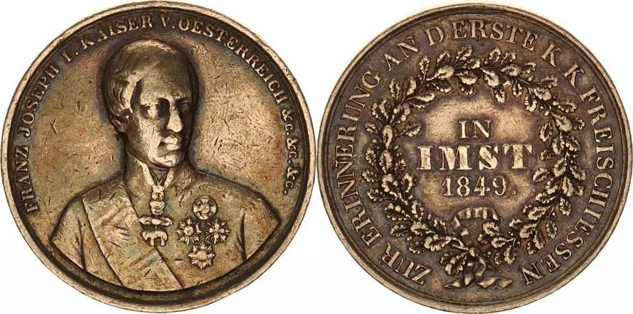Imst - Na památku první c.k. střelby v r. 1849, opis a v dubovém věnci 3-řádk. nápis / Polopostava F.J.I. mírně zprava, opis Ag 41 mm 25,376 g Taul -, Hauser -, Morosini -, Rauch - Auk ce 91 (2012) pol. 5 "RR"