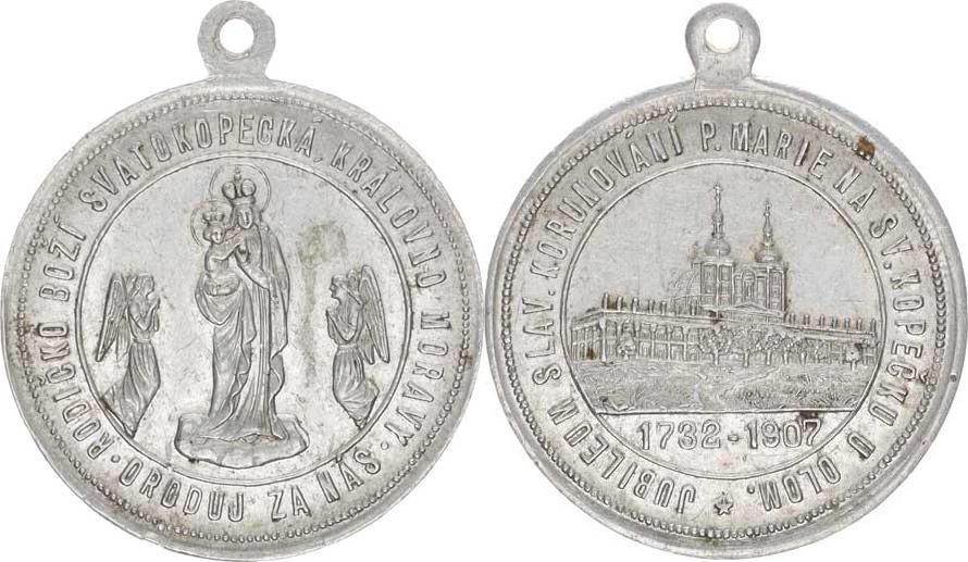 Olomouc - 175. jubil. slav. korunování P. Marie na Sv. Kopečku 19 07, Chrám na Kopečku, opis / Madona s dítětem na oblacích, po str anách andělé Taul 368 Al 33 mm pův. ouško