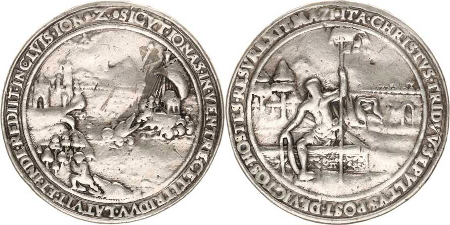 Německo (16.-17. stol.) - Medaile na biblický citát: "Jako byl Jo náš tři dny a tři noci v břiše velryby, tak bude Syn člověka tři dny a tři noci v srdci země (Mt. 12,40) Av: Scéna Jonáš a velryb a, latin. opis / Rv. Výjev Zmrtvýchvstání Krista, latin. o