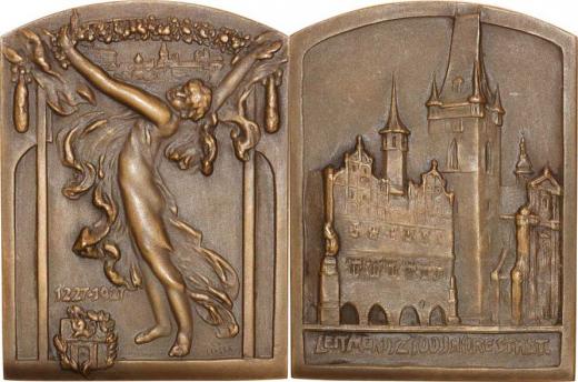 700 let založení města 1927, dívka věší girlandu v okně, znak, vr očení / významné budovy, německý nápis sign.: LEISEK bronz. plaketa 53x71 mm 117,30 g "R"