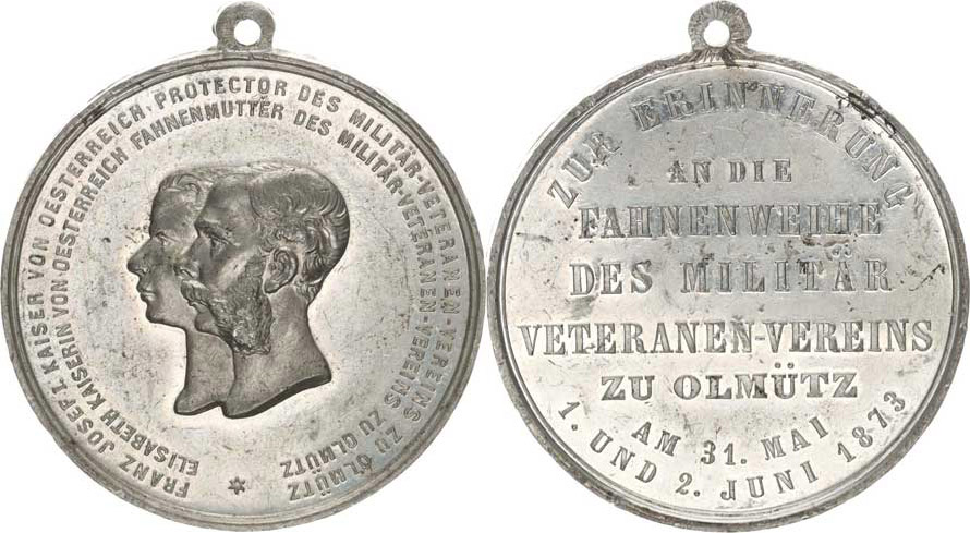 Na paměť svěcení zástavy vojenských vysloužilců v Olomouci 1873, Hlava F. J. I. a Alžbětina vlevo, opis ve dvou kruzích / 8-mi řád k. němec. nápis Sn 42 mm pův. ouško Taul 459
