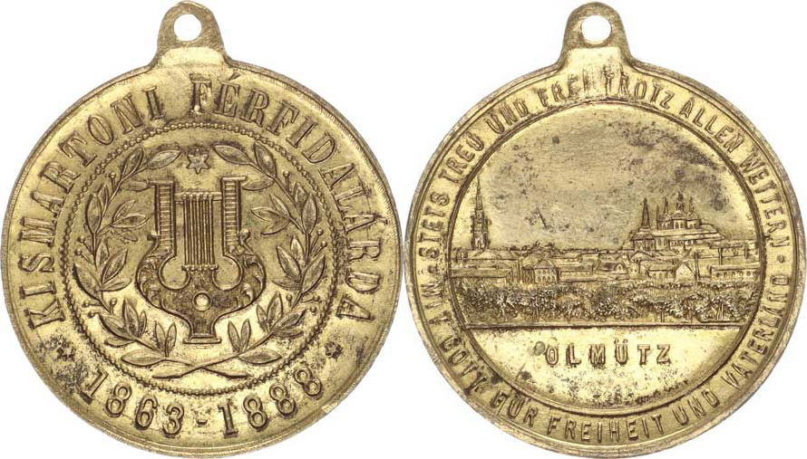 25. výr. setkání s maďarským sborem, Lyra ve věnci, opis: KISMART ONI FÉRFIDALÁRDA 1863-1888 / rv. použit stejný jako u Taul 467-46 8 zlac. mosaz 33,5 mm pův. ouško T -,