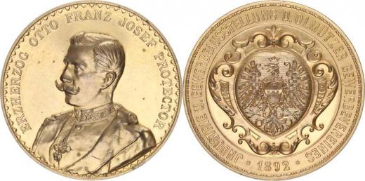 Průmyslová a živnostenská výstava 1892, orlice v zdobené kartuši / Protektor arciv. Otto Franz Josef, poprsí zprava a opis sign.: SCHWERDTNER zlac. bronz 51 mm (uděleno 30 ks!) viz Zprávy KVMO 236/1985 str.7-12, Taul 473