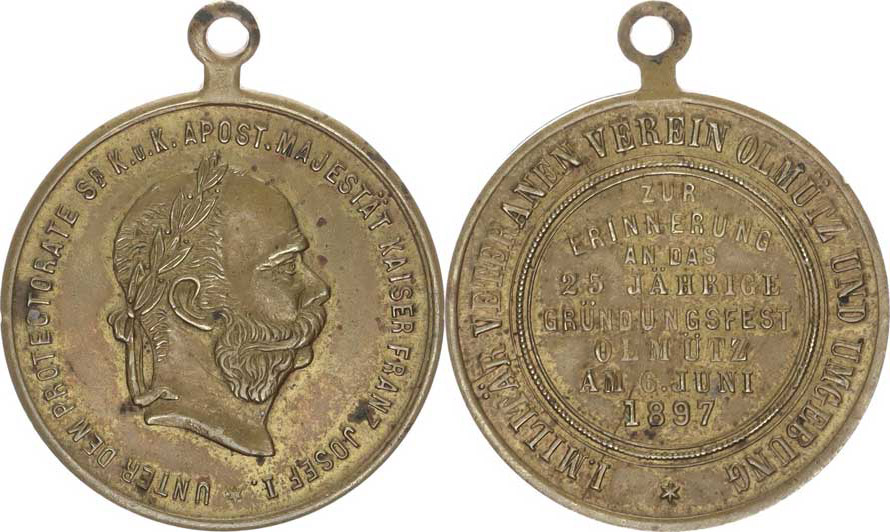 Protector císař F. J. I., hlava zprava, opis / I. vojenský veterá nský spolek, Slavnost na památku 25. výr. založení 6.6. 1897 8mi řádk. němec. nápis +opis mosaz 31 mm pův. ouško Taul neuvádí