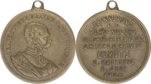 Na paměť svěcení zástavy vojenských vysloužilců v Olomouci 1905, Poprsí F.J.I. vpravo a opis / 9-ti řádk, němec. nápis Taul 4 94 mosaz 28 mm pův. ouško